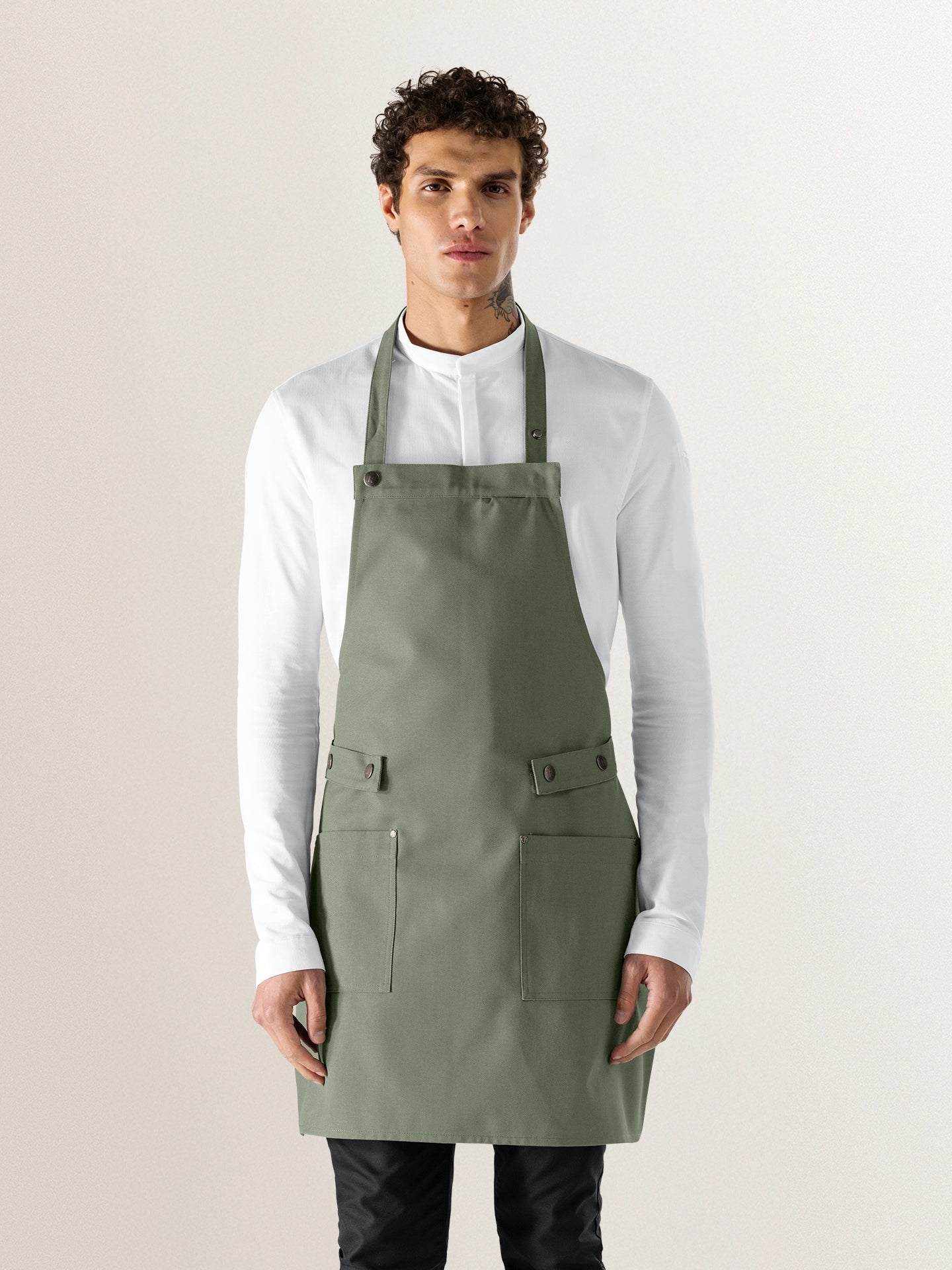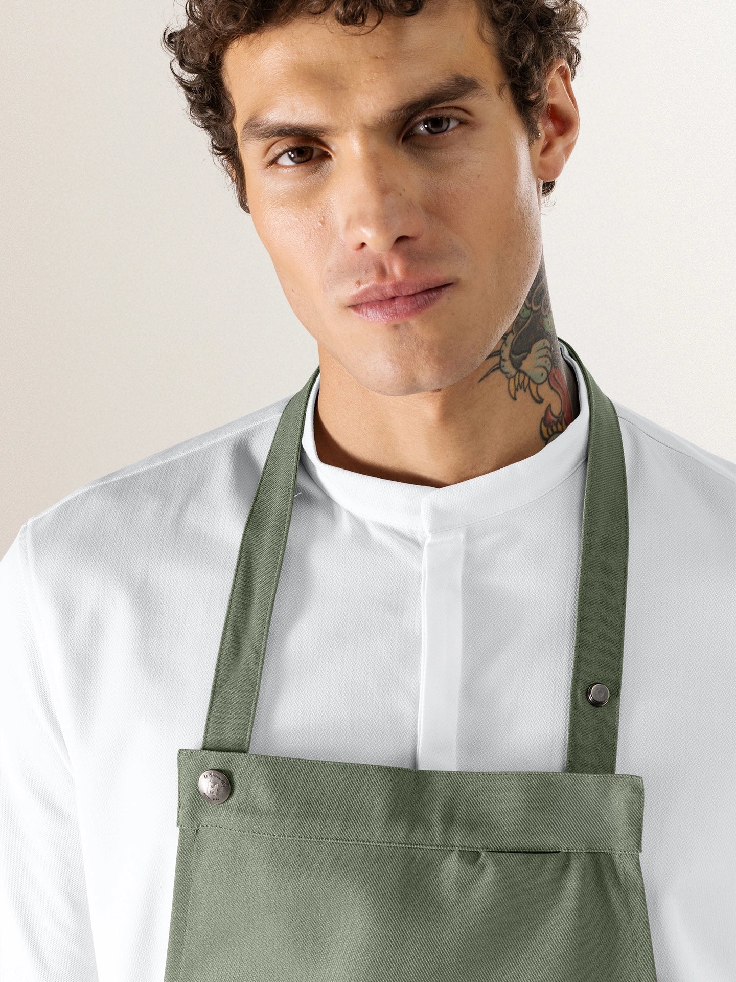 | Produktmerkmale | Abnehmbarer Nackengurt und Bund Dezente Markendetails (Nieten mit H) Sowohl für das Service- als auch für das Küchenpersonal Unisex Verstellbarer Nackengurt Zwei Taschen |