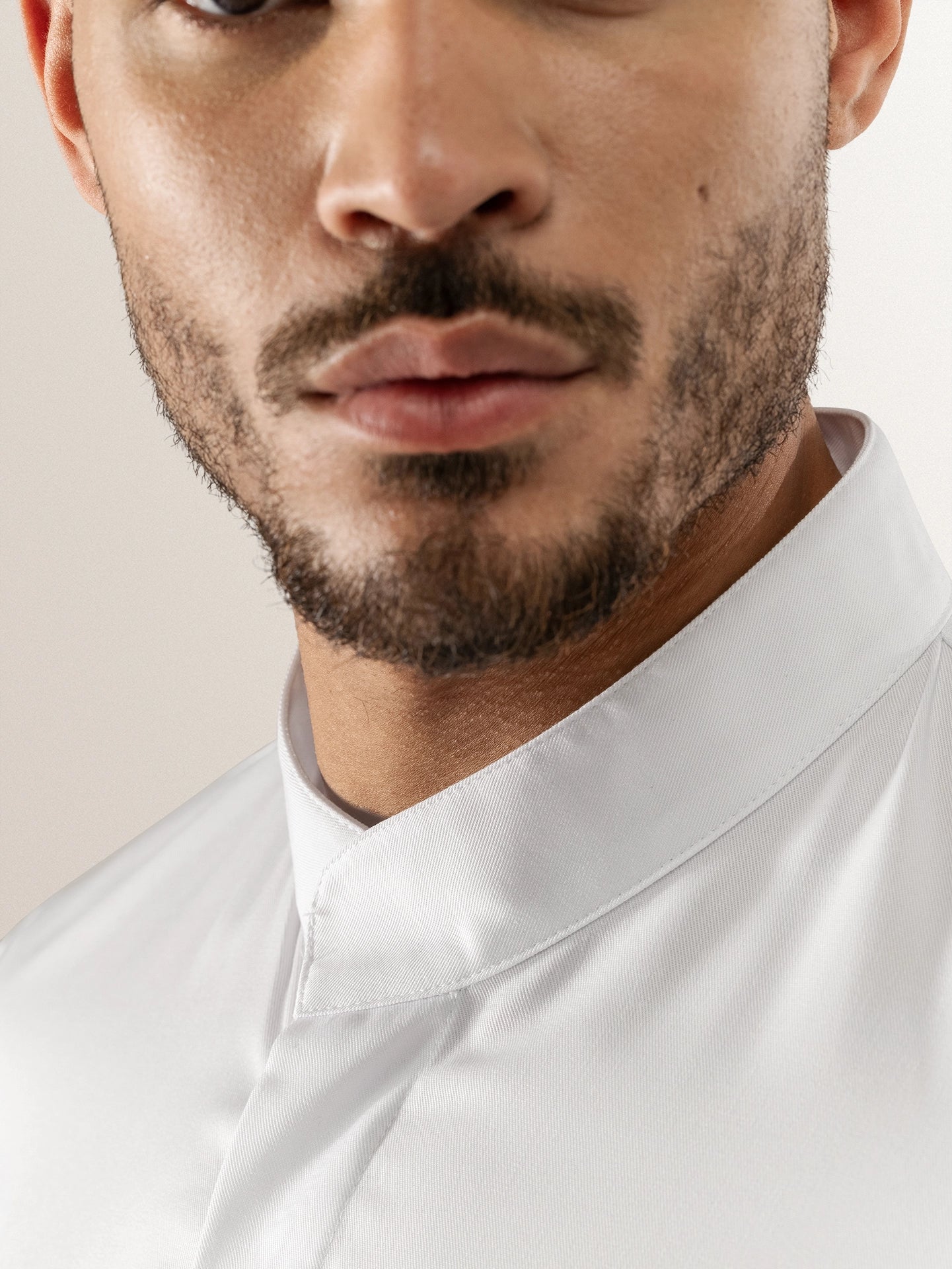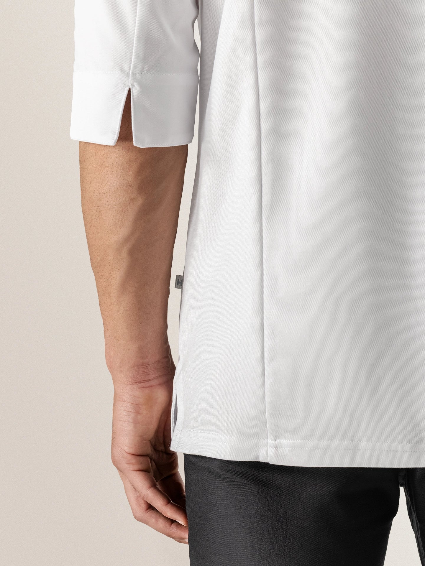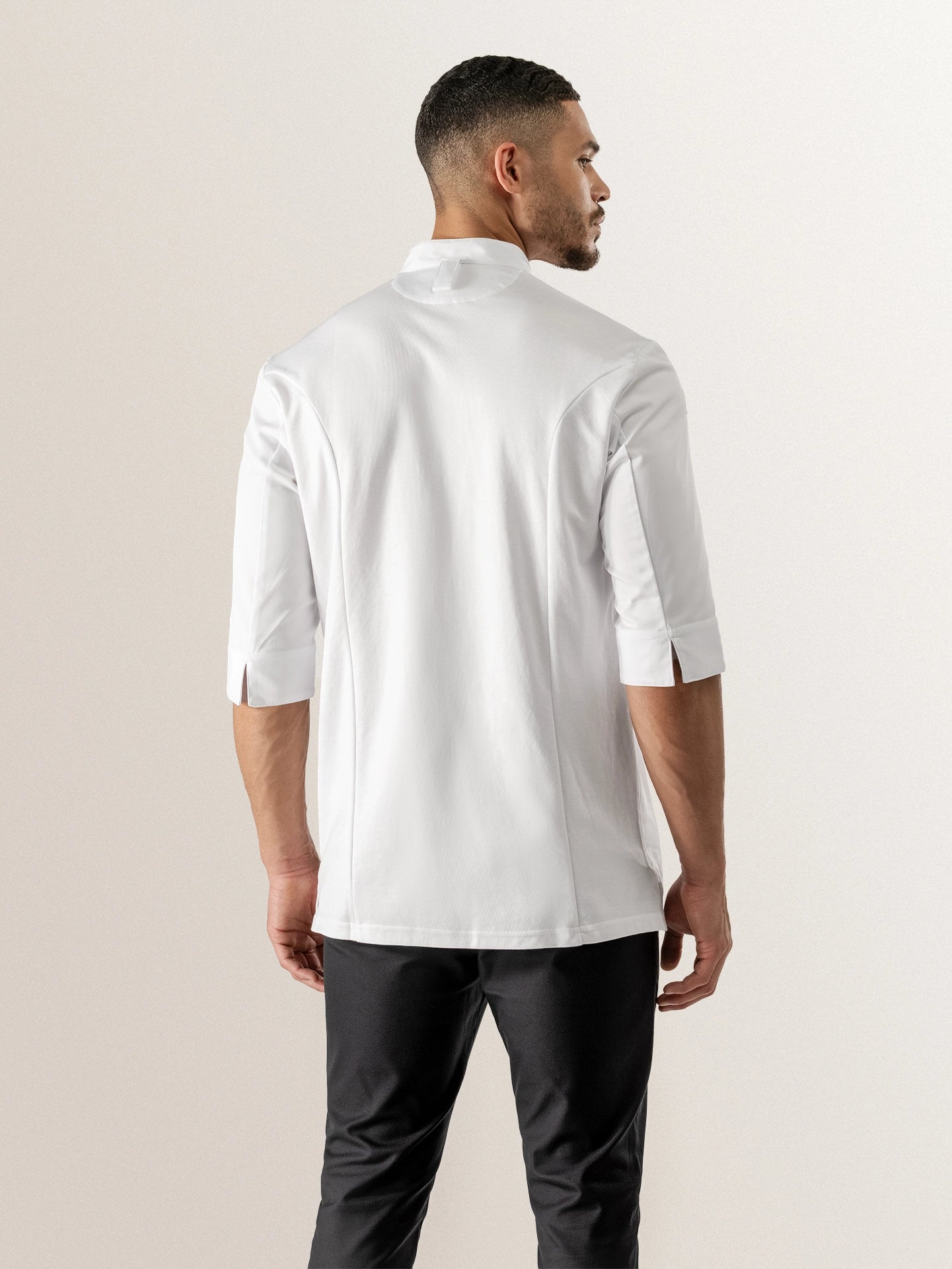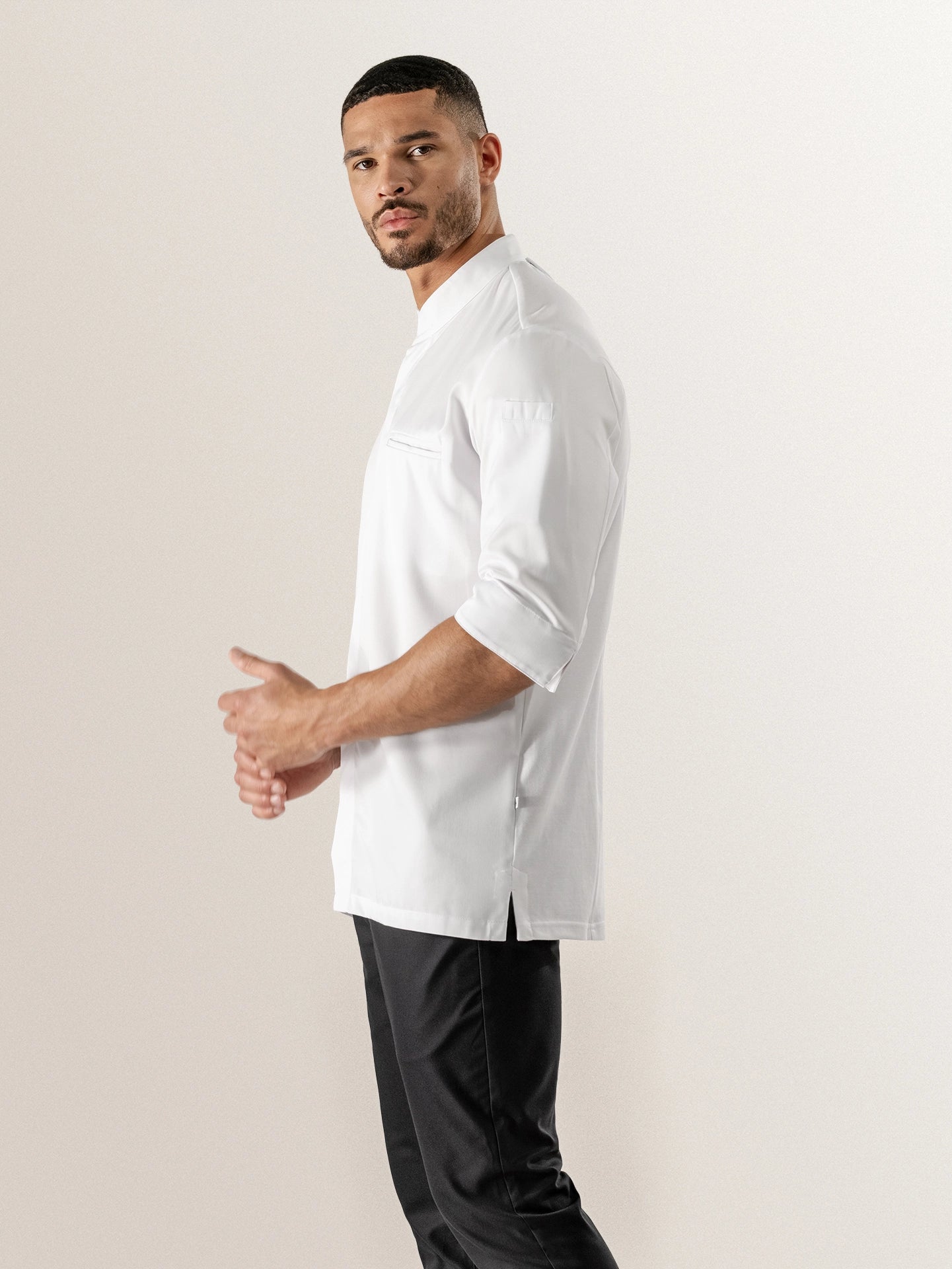 | Produktmerkmale | 3/4 Ärmel Brusttasche und Stifttasche am Ärmel Gesticktes Le Nouveau Chef H auf dem Ärmel Hoher Stehkragen Schürzenschlaufe mit Druckknopf Unsichtbare Druckknöpfe |