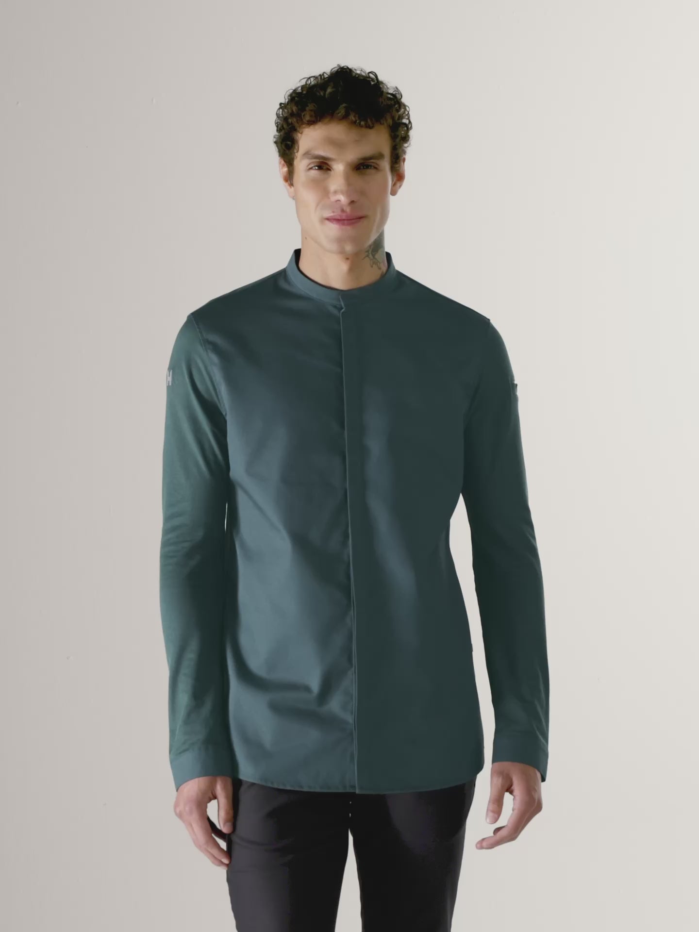 | Produktmerkmale | Gesticktes Le Nouveau Chef H auf dem Ärmel Lange Ärmel Mao-Kragen Schürzenschlaufe mit Druckknopf Tasche am Ärmel Unsichtbare Druckknöpfe |